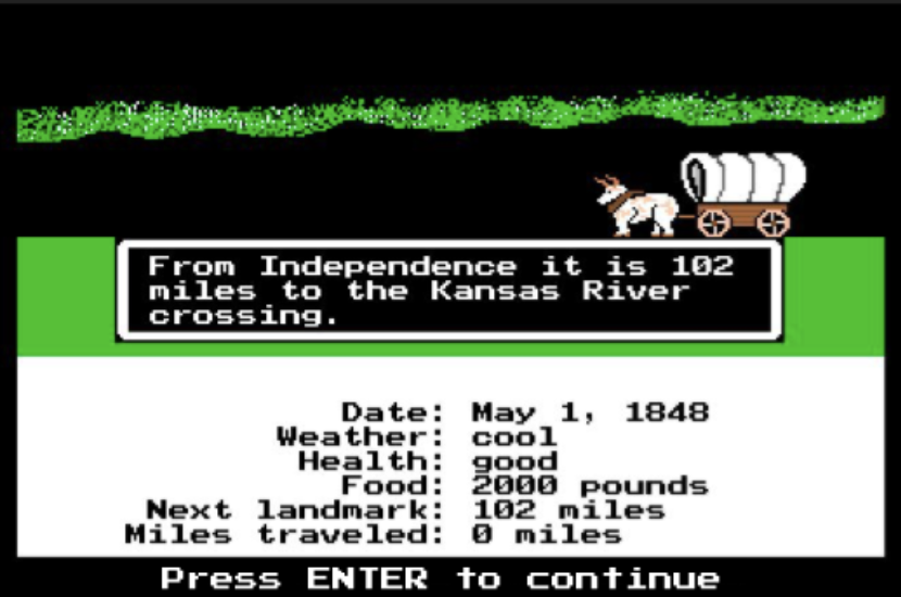 The Oregon Trail is surprisingly complex. The player’s current location on the trail factors in to the weather algorithms. Very hot weather can affect health, and very cold weather can too, if the player’s clothing supplies are low. Food supply also affects health. The player’s pace along the trail is determined by the health of their team of oxen. All of these calculations (and more!) are made by the game every single “day” that passes on the trail screen.